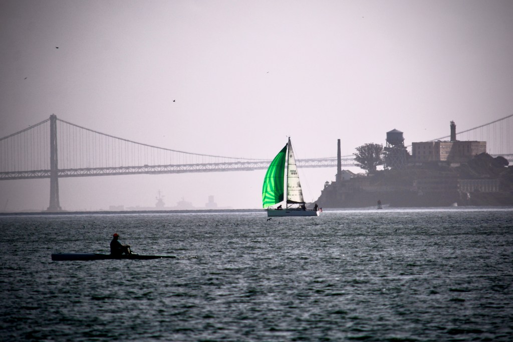 Most of the Bay was in shadows when I shot this image. But there was still enough sunlight coming through the Golden Gate to light one small yacht as it sailed in front of Alcatraz Island. It took me several attempts to achieve the composition that stacks the man in the rowboat, the yacht, Alcatraz, the Bay Bridge and several other ships in the distant fog. The result was an image with enough depth to take the viewer deep into the frame.