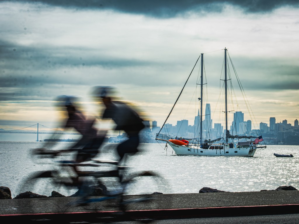 Cyclists pass through the area by the dozens drawn by the low speed limits for cars and the picturesque views. Visiting yachts and the San Francisco skyline are ever present. The skies are overcast and low.